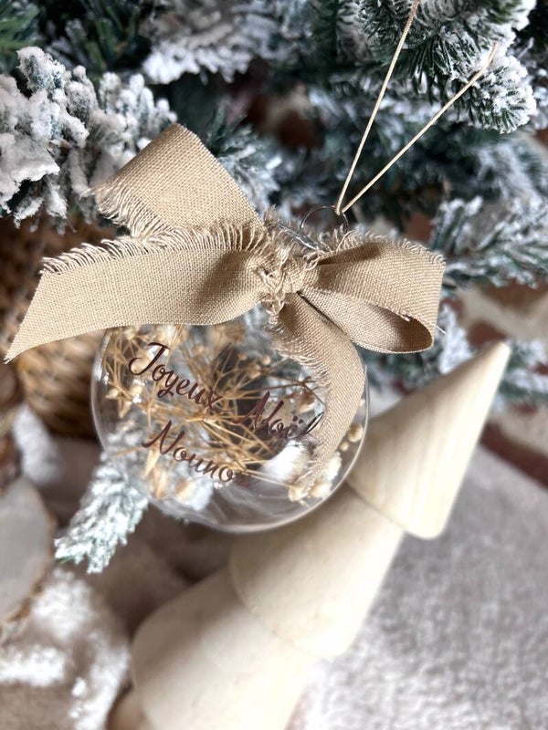 Boule de Noël transparente avec des gypsophiles et personnalisation.